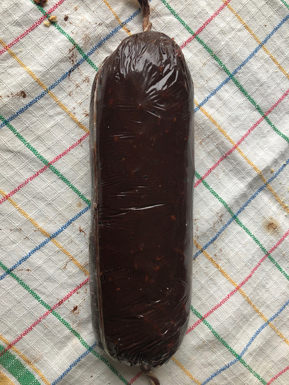We cut a piece of film, pour the mixture we have prepared over it and shape it with our hands until it has taken on the appearance, in fact, of a salami. This is fan! :)